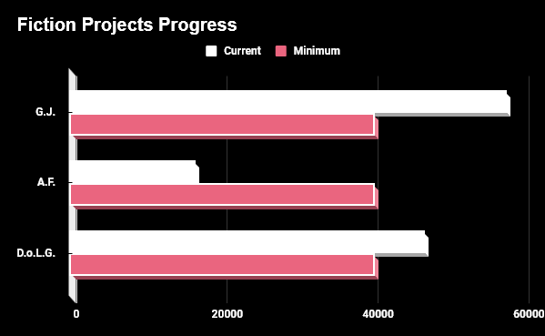 I put current in quotes because I’m still just working on G.J. None of the other bars have moved even a little, don’t waste your time looking at them. But you can see that we are climbing closer and closer to 60,000 words in G.J. and that’s just a Good Job all arou–I’m not going to stop making this joke until the title is revealed or changed.